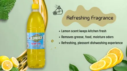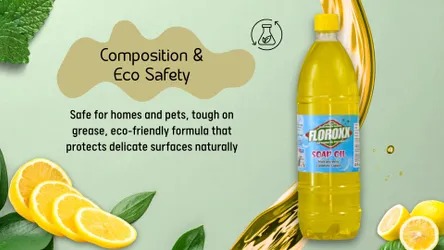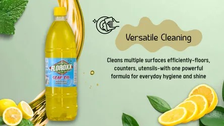Soap Oil Multipurpose Cleaner Cleaning is not just about removing dirt—it’s also about creating a fresh and inviting environment. Floroxx Soap Oil leaves behind a refreshing lemon fragrance that keeps your surroundings smelling clean and pleasant.